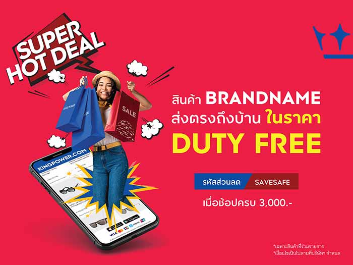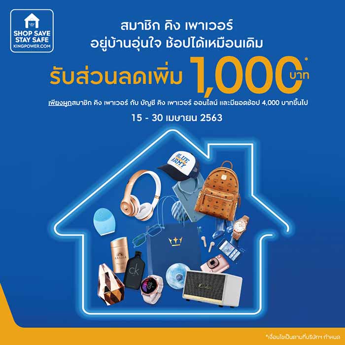 บริการพิเศษ KING POWER SHOP SAVE STAY SAFE #ช้อปที่บ้านมีแต่SaveกับSafe เป็นบริการที่ คิง เพาเวอร์ ทำขึ้นเพื่อตอบโจทย์โดยเน้นให้ทุกคนไม่ต้องเดินทางออกจากบ้าน หรือให้การออกนอกบ้านเป็นไปในระดับน้อยที่สุด และยังช่วยพันธมิตรธุรกิจและผู้บริโภค ได้มีช่องทางจำหน่าย และซื้อสินค้า ทั้งสินค้าแบรนด์เนมที่ร่วมแคมเปญในราคา Duty Free ที่จัดส่งถึงบ้าน และสินค้า Non Duty Free ได้แก่ เครื่องใช้อิเล็กทรอนิกส์, สินค้าเพื่อสุขภาพ, สินค้าแฟชั่น, ผลิตภัณฑ์ความงาม, อาหาร และขนมทานเล่น, เครื่องใช้ในบ้าน, ชุดและอุปกรณ์กีฬา, นาฬิกา และสินค้าแม่และเด็ก ผ่านช่องทางออนไลน์ www.kingpower.com และแอปพลิเคชั่น KING POWER โดยไม่มีค่าจัดส่งสินค้า และมั่นใจได้ว่าเป็นสินค้าคุณภาพของแท้100% พร้อมความคุ้มค่ามากมาย ทั้งส่วนลด และสิทธิประโยชน์ที่มอบให้กับลูกค้าสมาชิก และโปรโมชั่นพิเศษสำหรับผู้สมัครสมาชิกใหม่ อาทิ ส่วนลดทันที 200 บาท, การใช้กะรัตสะสมแทนเงินสดในการซื้อสินค้า, สิทธิการผ่อนชำระสินค้าและรับเครดิตเงินคืนจากธนาคาร เป็นต้นพร้อมจัดสินค้าโปรโมชั่นพิเศษหมุนเวียนนำมาคืนกำไร ให้ลูกค้าตั้งแต่เดือนเมษายน ถึง มิถุนายน นี้