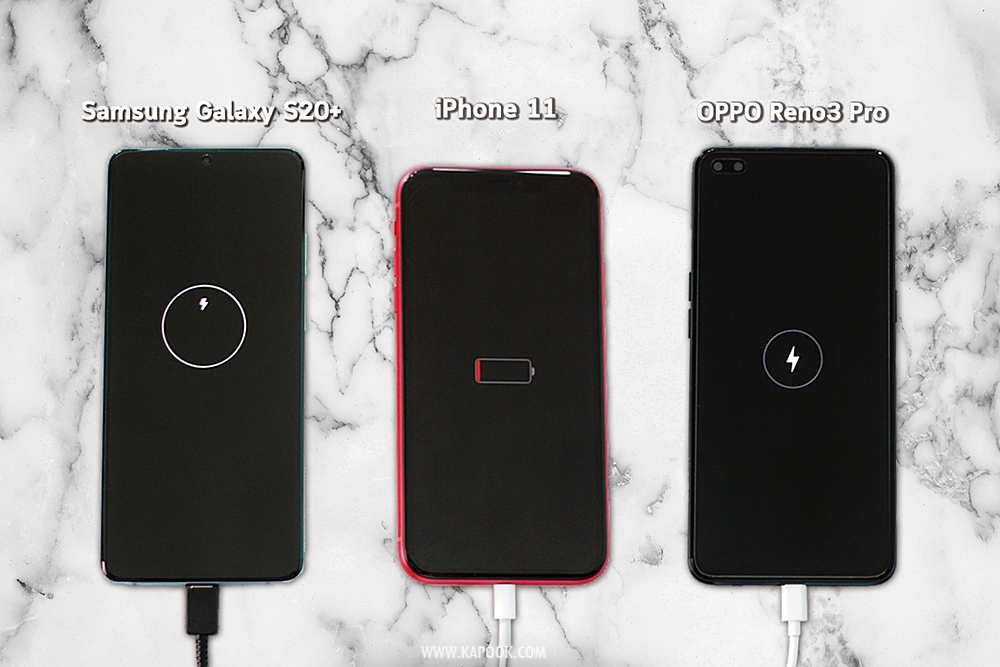 OPPO Reno3 Pro ชาร์จได้ 100% เต็ม อาจด้วย “30W VOOC Flash Charge 4.0” เทคโนโลยีชาร์จไวอันเลื่องชื่อของ OPPO จึงทำให้การชาร์จแบตเตอรี่เร็วกว่าเครื่องอื่น ๆ ในขณะที่ Samsung Galaxy S20+ ระดับแบตเตอรี่ได้มาที่ 62% และ iPhone 11 ระดับแบตเตอรี่อยู่ที่ 34% เท่านั้นเอง