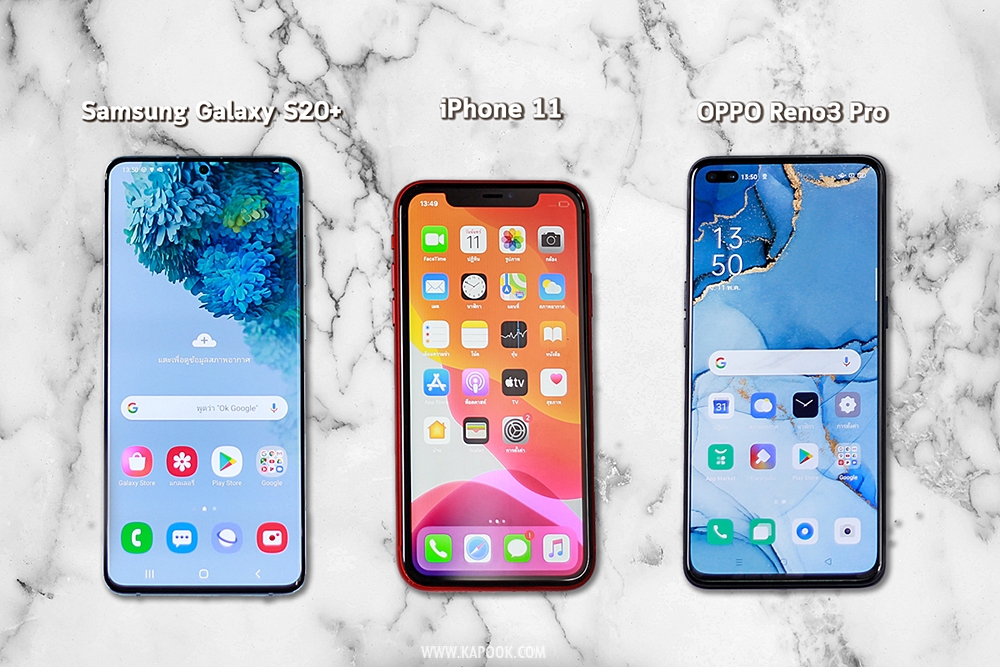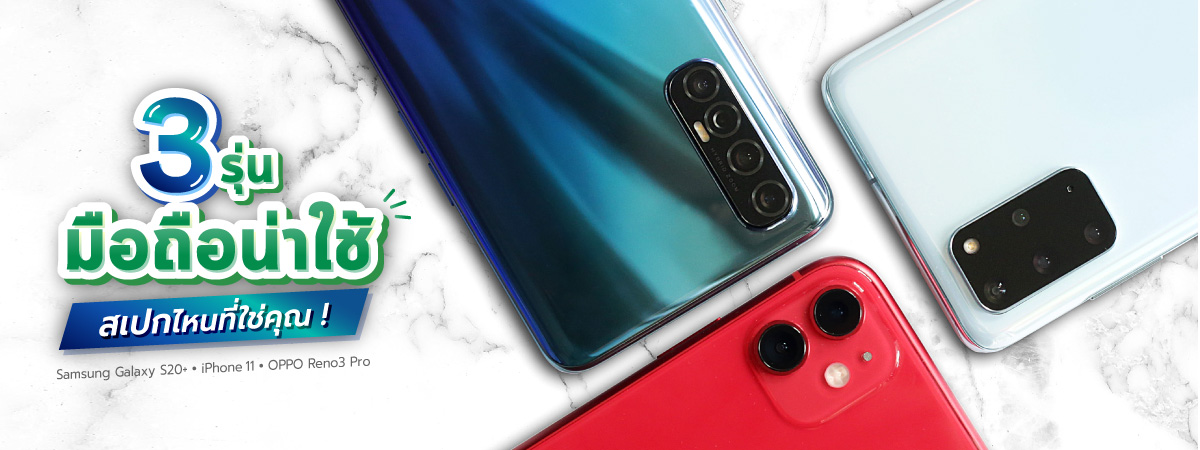 เปรียบเทียบสเปก 3 รุ่นมือถือน่าใช้ Samsung Galaxy S20+, iPhone 11 และ OPPO Reno3 Pro ทั้งในแง่การดีไซน์ สเปกตัวเครื่อง ความลื่นไหล รวมถึงสมรรถนะของกล้องถ่ายรูปและวิดีโอ มาดูกันว่าแต่ละรุ่นนั้นแตกต่างกันอย่างไร