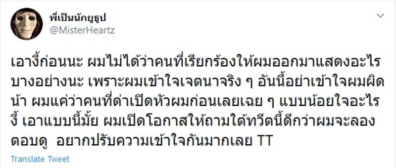 5. สุดท้าย เอก HRK ก็ได้ทวีตข้อความว่า "เอางี้ก่อนนะ ผมไม่ได้ว่าคนที่เรียกร้องให้ผมออกมาแสดงอะไรบางอย่างนะ เพราะผมเข้าใจเจตนาจริง ๆ อันนี้อย่าเข้าใจผมผิดนะ ผมแค่ว่า คนที่ด่าเปิดหัวผมก่อนเลยเฉย ๆ แบบน้อยใจอะไรงี้ เอาแบบนี้ไหม ผมเปิดโอกาสให้ถามใต้ทวีตนี้ดีกว่า ผมจะลองตอบดู อยากปรับความเข้าใจกันมากเลย TT"
