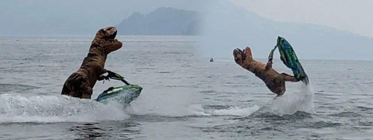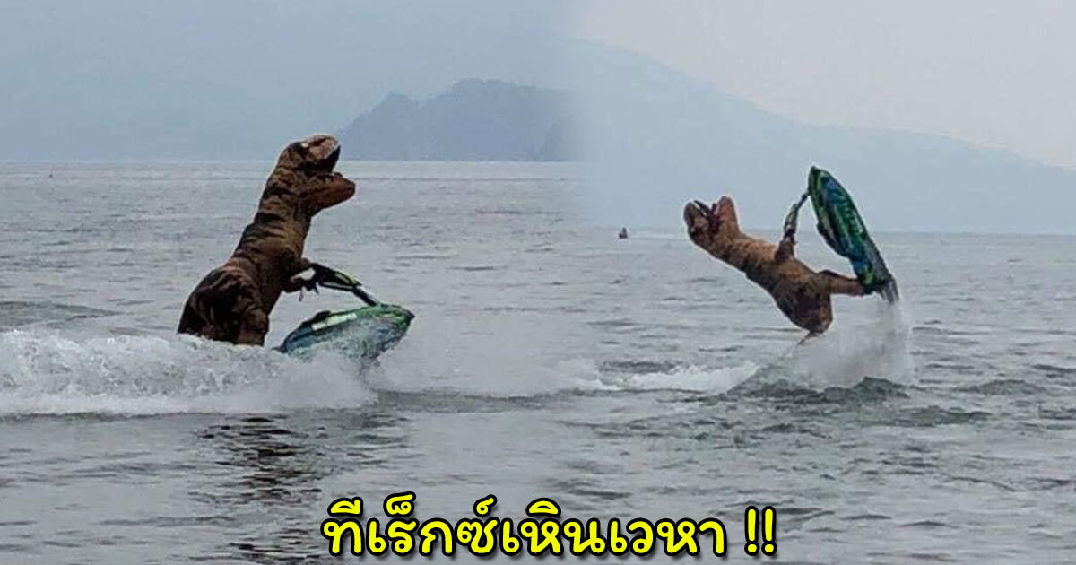 เปิดภาพชวนฮา แต่งมาสคอตเป็นทีเร็กซ์ ขี่เจ็ตสกีตีลังกากลับหลัง สร้างรอยยิ้มให้ชาวเน็ตอย่างท่วมท้น