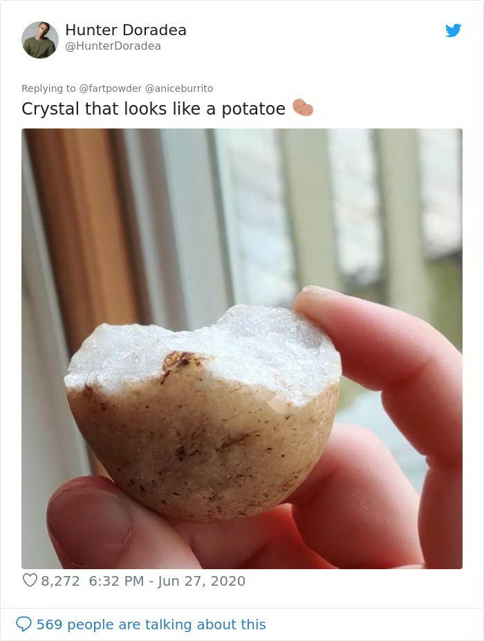 โดยหลังจาก GarlicPowder ที่ใช้ชื่อบน Twitter ว่า @fatpowder ได้เริ่มนำภาพคริสตัลที่ดูเหมือนกับไก่ไม่มีกระดูกมาโพสต์ จนมีคนเข้ามาคอมเมนต์และกดไลก์ไปกว่า 2.8 แสนครั้ง ส่งผลให้ภาพดังกล่าวกลายเป็นไวรัลแร่อัญมณีที่เหมือนของกิน ที่ชาวเน็ตนำแร่อัญมณีที่ดูคล้ายของกินที่ที่พวกเขามีอยู่มาแชร์ต่อ ๆ กันจำนวนมาก