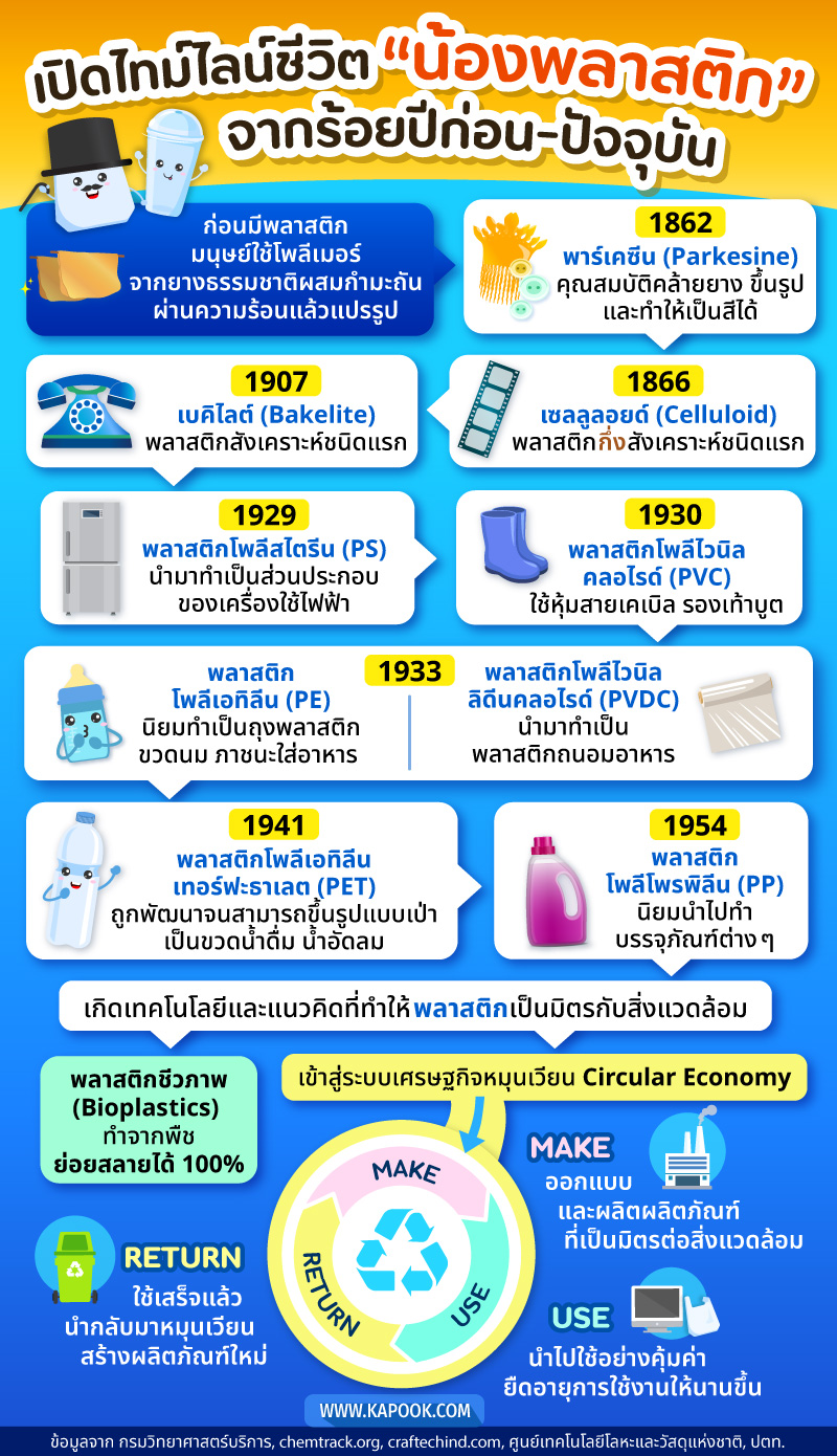 ส่องไทม์ไลน์ชีวิตน้องพลาสติกตั้งแต่ยุคบุกเบิกจนถึงปัจจุบัน กว่าจะเป็นผลิตภัณฑ์ยอดนิยมอย่างทุกวันนี้ ผ่านอะไรมาบ้าง ? ก่อนจะเข้าสู่ Circular Economy ระบบเศรษฐกิจหมุนเวียนที่จะมาเปลี่ยนโลกของพลาสติกไปตลอดกาล