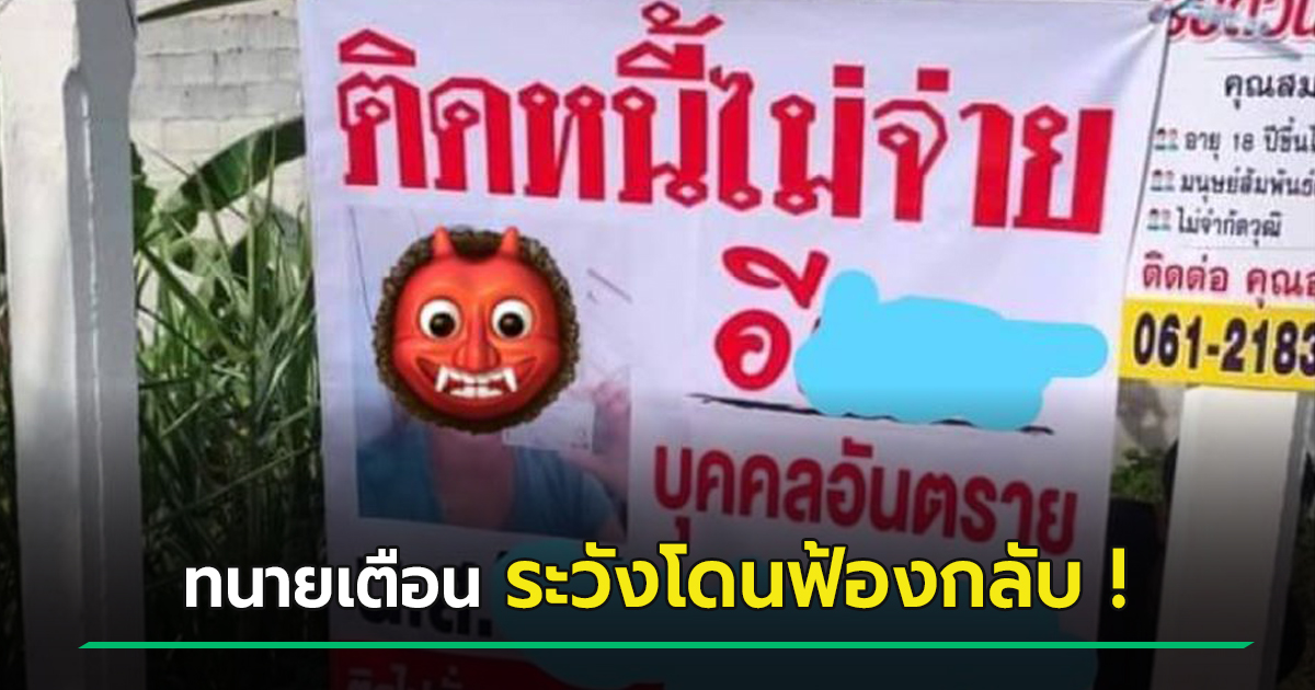 แชร์สนั่น เจ้าหนี้ขึ้นป้ายไวนิลประจานลูกหนี้ ลั่นเป็นบุคคลอันตราย ก่อนถอดเก็บในเวลาต่อมา ทนายดังเตือนระวังเจอฟ้องกลับ ลั่นอย่าทวงหนี้แบบมักง่าย