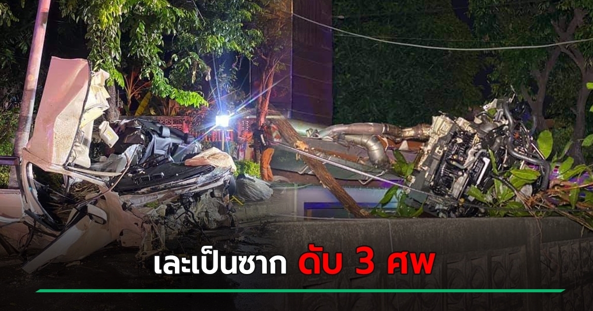 นักศึกษาซิ่งซีวิคฝ่าฝน เสียหลักชนโครมกับเสาไฟฟ้าแรงสูง เสียชีวิตคาที่ 3 ศพ พบรถพังเละทั้งคัน ชิ้นส่วนกระจาย เครื่องยนต์กระเด็กตกใส่หลังคาบ้าน