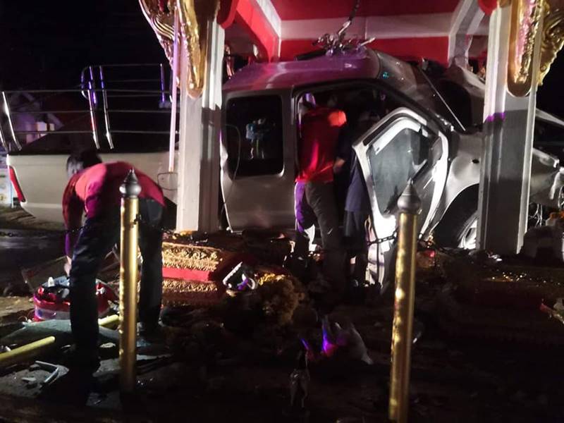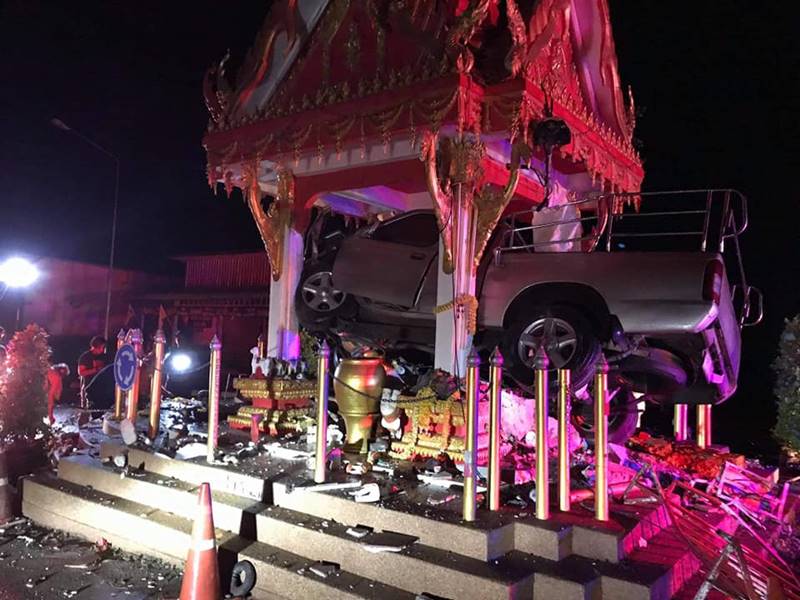 ตัวรถเสียบคาอยู่กับศาลหลักเมือง สภาพพังยับเยินทั้งรถทั้งศาล