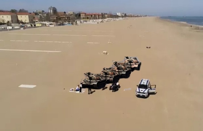 เมื่อวันที่ 17 เมษายน ที่ผ่านมา แฟนเพจเฟซบุ๊ก Comune di Rimini สำนักประชาสัมพันธ์ของเทศบางเมือง Rimini ได้เผยแพร่ภาพหนุ่มอิตาลีรายหนึ่งที่ออกมาฝ่าฝืนกฏกักตัวนอนชิลริมหาดอย่างสบายใจ ก่อนมีตำรวจ 2 นาย กำลังเดินเข้าไปหาเขา ส่งผลให้ภาพนี้ได้กลายเป็นกระแสบนโลกออนไลน์ทันที