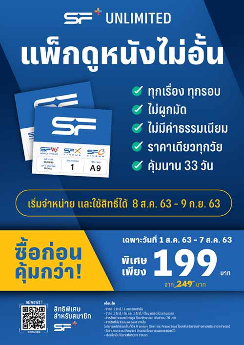 โรงภาพยนตร์ในเครือ เอส เอฟ อยากให้ทุกคนกลับมามีความสุขในการชมภาพยนตร์ จัดโปรแรง "SF+ UNLIMITED (เอส เอฟ พลัส อันลิมิเต็ด)" แพคเกจสุดคุ้ม รับสิทธิ์ดูหนังไม่จำกัดระหว่างวันที่ 8 สิงหาคม ? 9 กันยายน 2563 (จำกัด 1 สิทธิ์/วัน/เรื่องตลอดโปรแกรมฉาย)ในราคา 249 บาท พิเศษสุดสำหรับลูกค้าที่สมัครแพ็กเกจล่วงหน้าภายในวันที่ 1-7 สิงหาคม 2563 สามารถซื้อได้ในราคาเพียง 199 บาทเท่านั้น! โดยสามารถสมัครผ่านช่องทางออนไลน์แอปพลิเคชั่น SF Cinema ,เว็บไซต์ www.sfcinemacity.com หรือที่โรงภาพยนตร์ในเครือ เอส เอฟ ทุกสาขาทั่วประเทศ