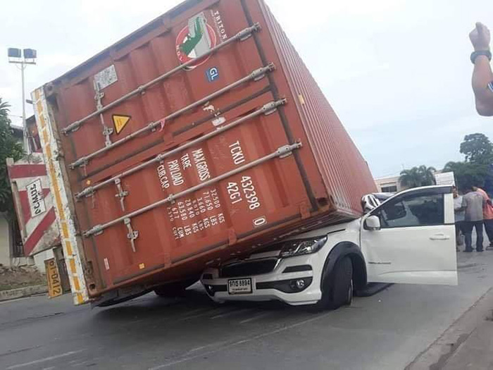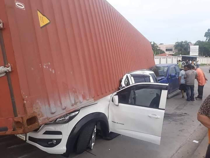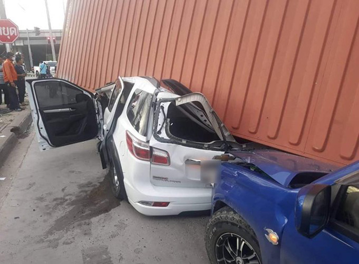 ตู้คอนเทนเนอร์ทับรถยนต์ มีผู้ได้รับบาดเจ็บ 4 ราย ไม่มีรายงานผู้เสียชีวิต