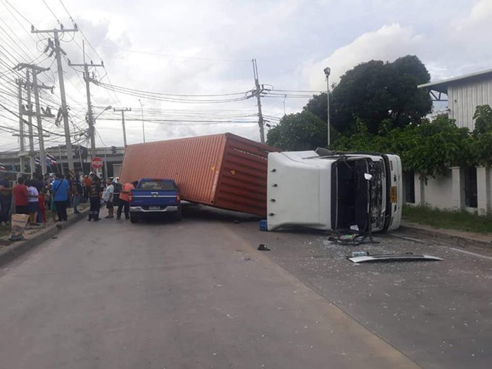รถพ่วงตู้คอนเทนเนอร์ 18 ล้อ เบรกแตกหักหลบไฟแดง ก่อนพลิกคว่ำ ตู้คอนเทนเนอร์ทับรถเก๋ง-รถกระบะพังยับ ได้รับบาดเจ็บ 4 ราย เคราะห์ดีไม่มีผู้เสียชีวิต