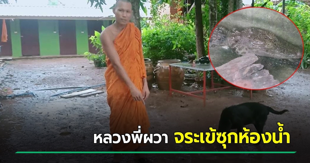 หลวงพี่แทบช็อก เข้าห้องน้ำวัด เจอไอ้เข้หลุดน้ำท่วมส่งเสียงขู่ ก่อนถูกพุ่งกัด โชคดีเห็นก่อนจึงหลบได้ทัน คาดหลุดจากบ่อเลี้่ยงหลังฝนตกหนัก