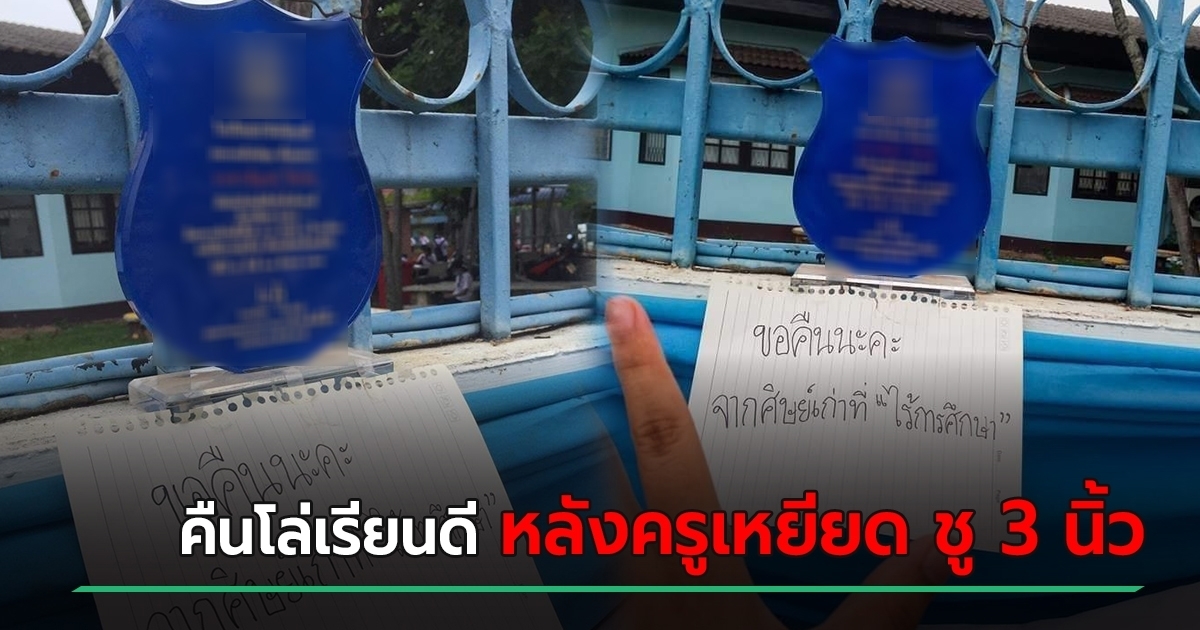 โซเชียลเผยภาพ ศิษย์เก่าโรงเรียนแห่งหนึ่ง หอบโล่ประกาศเกียรติคุณเรียนดี 4.00 คืนให้โรงเรียน หลังไม่พอใจกรณีครูรายหนึ่งเหยียดเด็กนักเรียนชู 3 นิ้ว ไร้การศึกษา