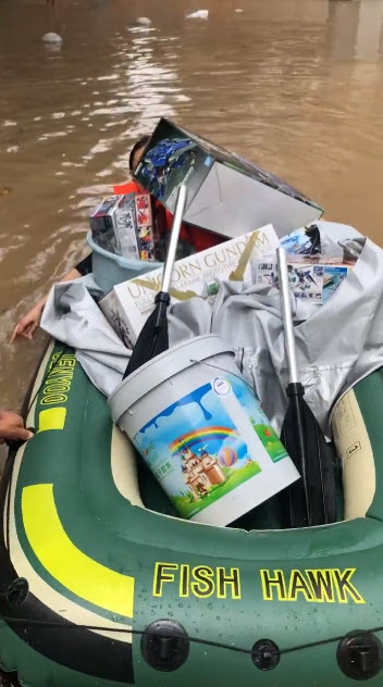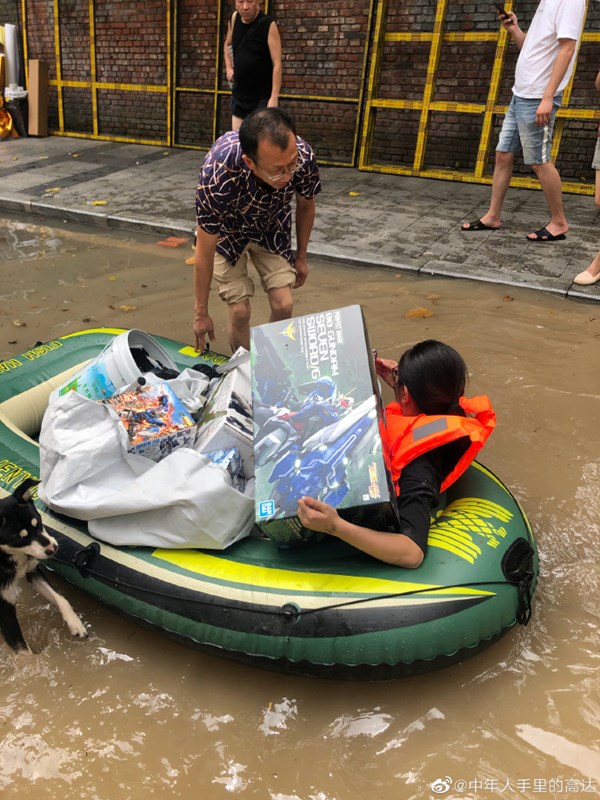 คลิปวิดีโอที่แชร์เป็นกระแสไวรัลบนสังคมออนไลน์ของจีน เผยให้เห็นหญิงคนหนึ่งอยู่ในเรือยางที่ลอยมาตามน้ำ ในอ้อมแขนและในเรือเต็มไปด้วยกล่องใส่กันดั้มของสามี การกระทำอันกล้าหาญยิ่งนี้ทำให้สามีตื้นตัน ซาบซึ้งจนแทบจะกลั้นน้ำตาเอาไว้ไม่ไหว เพราะแค่ภรรยาอนุญาตให้ซื้อกันดั้มมาสะสมก็นับว่ายอดเมียแล้ว แต่นี่ยังยอมเสี่ยงอันตรายเพื่อกันดั้มของเขาอีก