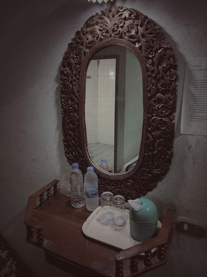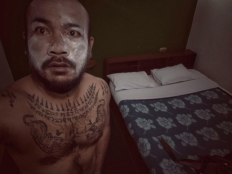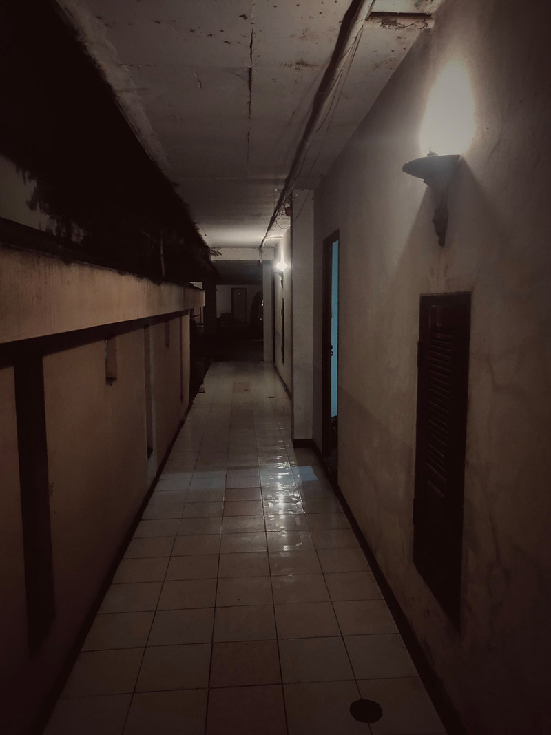 โดยเจ้าตัวโพสต์ภาพจุดต่าง ๆ ของโรงแรมทั้งในและนอกห้อง ซึ่งเจ้าตัวก็กล้า ๆ กลัว ๆ อยู่เหมือนกัน ยอมรับว่าบรรยากาศโรงแรมวังเวงมาก พร้อมระบุว่า "คืนนี้มีไนท์ตี้ช็อกแน่ ๆ พระก็ไม่ได้เอามา ไอ้ที่เยิ้มลงนี่คราบเลือดหรือไรอะ นี่ถ้าไม่ติดฝนตกหนักนะ กางเต็นท์ในป่าไปละ แต่นาน ๆ พักโรงแรมที 250 บาท ก็ดีอยู่นะ"