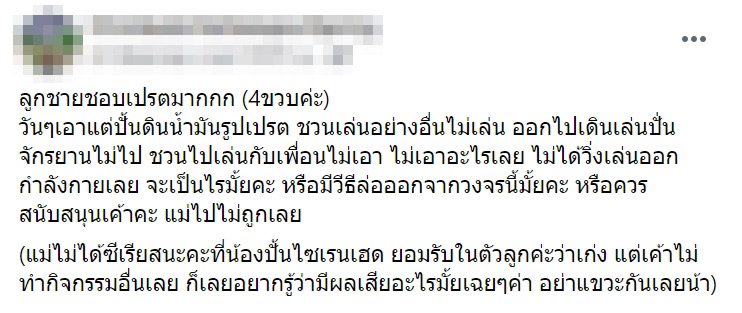 คุณแม่ระบุทิ้งท้ายว่า เธอไม่ได้ซีเรียสเรื่องที่ลูกปั้นไซเรนเฮด แต่กลับยอมรับในตัวลูกด้วยซ้ำว่าลูกเก่ง แต่แค่อยากรู้ว่าถ้าลูกไม่ทำกิจกรรมอื่นเลยจะมีผลเสียอะไรไหม พร้อมขอร้องคนที่จะมาคอมเมนต์อย่าแขวะกันเลย
