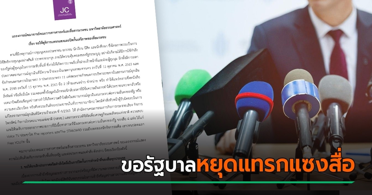 คณาจารย์คณะวารสารศาสตร์และสื่อสารมวลชน มหาวิทยาลัยธรรมศาสตร์ ออกแถลงการณ์ ขอรัฐหยุดแทรกแซงสื่อ ชี้ ประชาชนมีสิทธิอันชอบธรรมในการเข้าถึงข้อมูลข่าวสารจากแหล่งต่าง ๆ