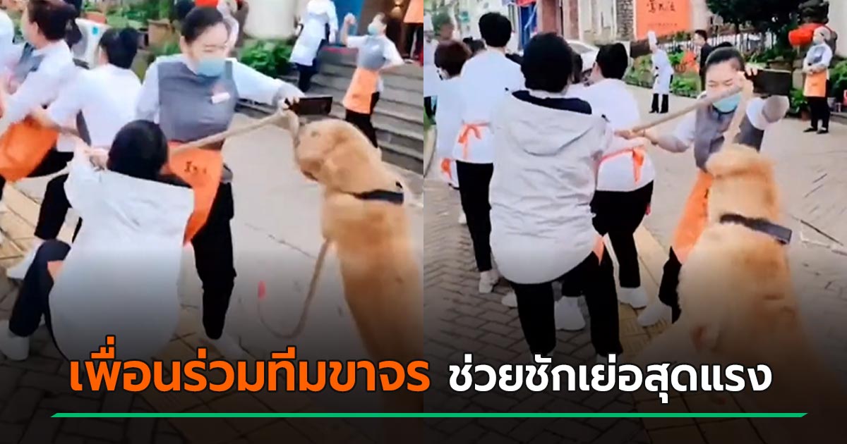 และเพื่อนร่วมทีมขาจรตัวนี้ก็ไม่ได้มาเล่น ๆ มันทุ่มให้สุดแรงพลัง ทั้งใช้ปากงับเชือก และกระโดดพยายามเอาขาเกี่ยวเชือก จนในที่สุดฝั่งนี้ก็สามารถคว้าชัยมาได้สำเร็จ งานนี้ไม่รู้ว่าเป็นเพราะพละกำลังอันล้นเหลือของเจ้าตูบหรือไม่ แต่เป็นกำลังใจที่ให้พี่ ๆ พนักงานเต็มร้อยจริง ๆ