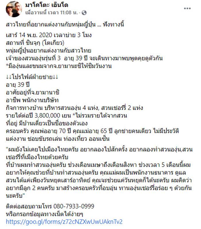 ที่โพสต์ประกาศรับสมัครสาวไทยที่อยากแต่งงานกับหนุ่มชาวญี่ปุ่น ซึ่งสาว ๆ