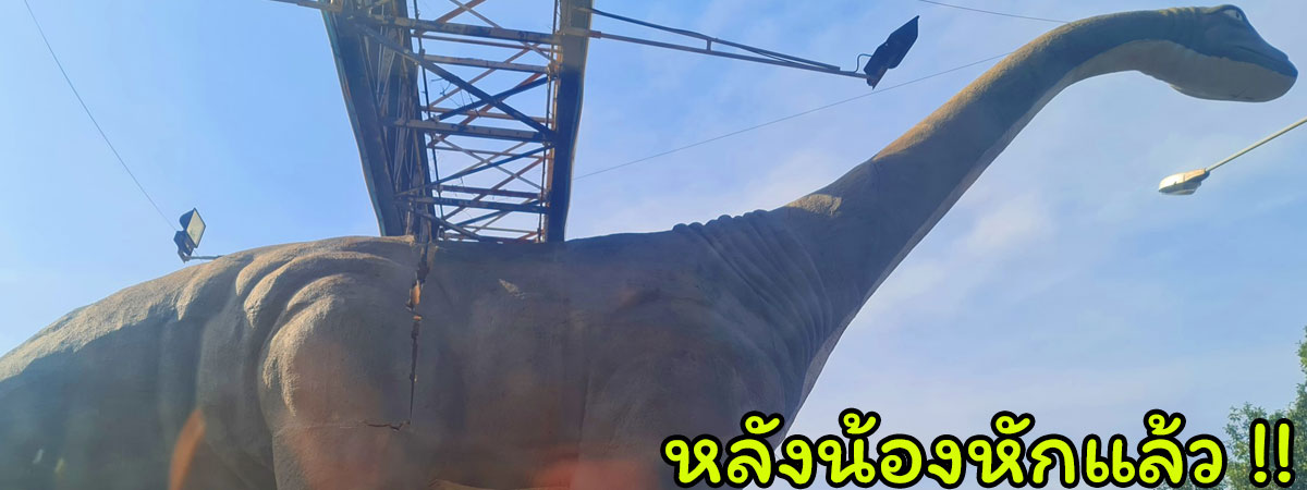 เปิดภาพที่เป็นกระแสไวรัลบนโลกออนไลน์ หุ่นไดโนเสาร์ที่ขอนแก่น หลังจากโดนรถชนขาหัก ตอนนี้หลังหักแล้ว