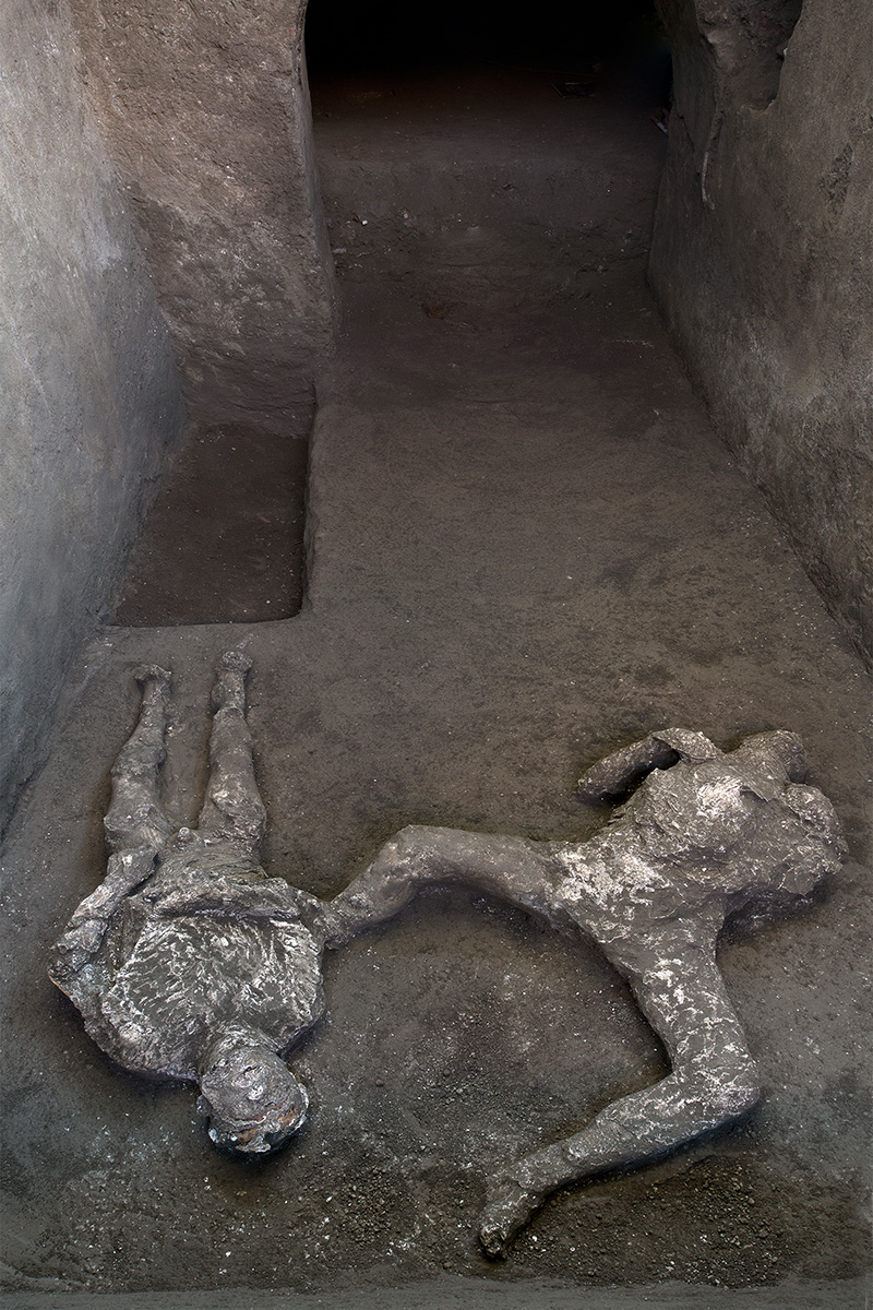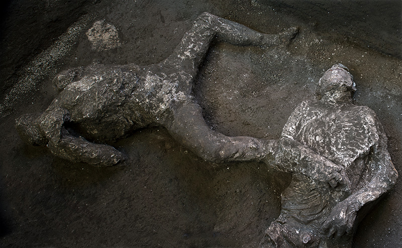 พบร่างมนุษย์ 2 ร่าง ที่ ปอมเปอี เชื่อเป็นเจ้านายและทาส วิ่งหาที่หลบภัย แต่สุดท้ายตายคู่ ถูกเถ้าถ่านภูเขาไฟ ฝังทั้งเป็น