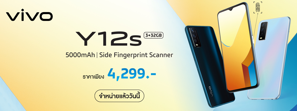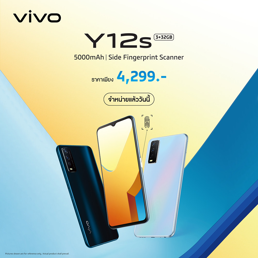 - Vivo Y12s วางจำหน่ายวันแรก ในราคา 4,299 บาท โดยมีให้เลือกถึง 2 สีด้วยกัน ได้แก่ Phantom Black ( สีดำ), Glacier Blue (สีน้ำเงิน)