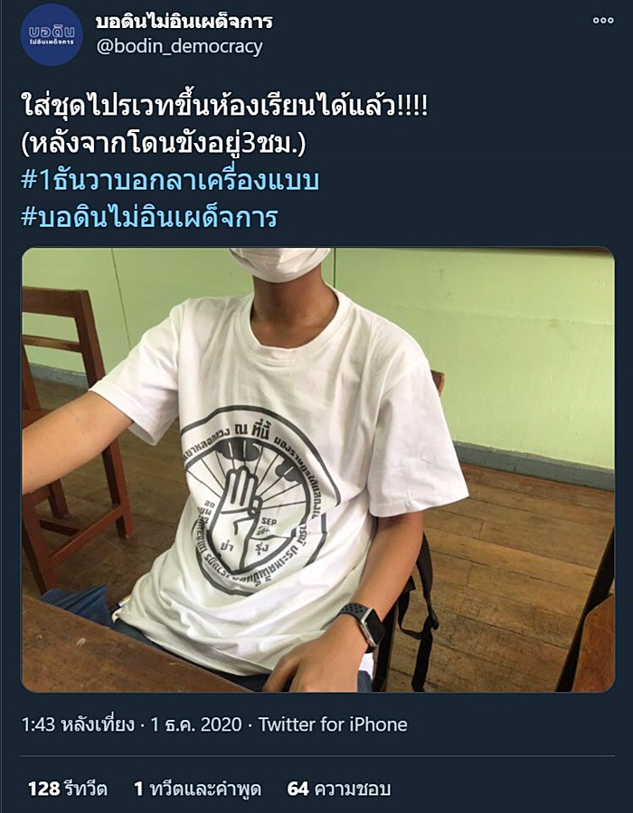 ล่าสุด วันที่ 1 ธันวาคม 2563 แนวหน้า รายงานว่า บรรยากาศที่โรงเรียนอุดรพิทยานุกูล โรงเรียนประจำจังหวัดอุดรธานี มีนักเรียนบางส่วนที่แต่งชุดไพรเวตมาโรงเรียนในขณะที่ตอนเข้าแถวเคารพธงชาติ ก็มีนักเรียนบางกลุ่มพากันชู 3 นิ้ว ซึ่งทางนายธวัช ทุมมนตรี ผอ.โรงเรียน เผยว่า ไม่ได้มีการห้ามใส่ชุดไพรเวตแต่อย่างใด ตนมองว่าการไปห้ามก็จะเป็นอีกกระแสหนึ่ง บางทีอาจจะรับมือไม่ไหว อย่างไรก็ตาม เรื่องนี้ก็ต้องยึดตามกฎกระทรวง และอย่าใช้ความรุนแรงอย่าปะทะกับเด็ก เพราะเขาก็คือลูกของเรา เราก็ต้องให้โอกาสและรับฟังความคิดเห็น