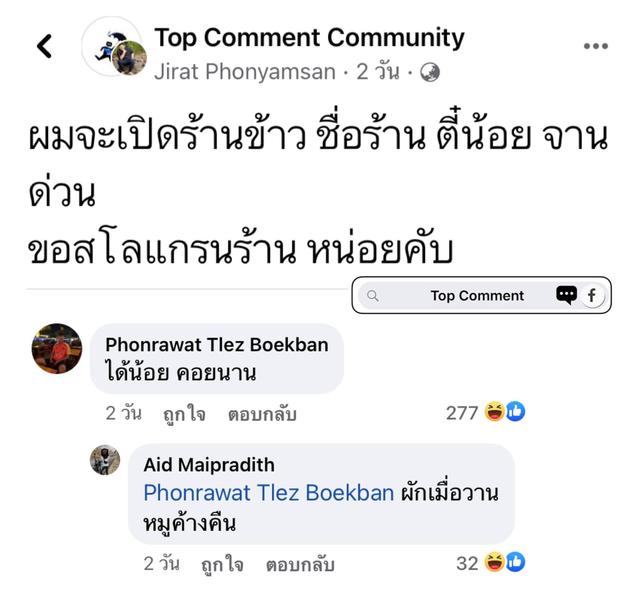 ชมภาพขำ ๆ จากกลุ่มผู้ใช้เฟซบุ๊ก Top Comment เมื่อชาวเน็ตรายหนึ่งโพสต์แคปชั่นขอความช่วยเหลือ "ผมจะเปิดร้านอาหาร ชื่อร้านตี๋น้อย จานด่วน ขอสโลแกนร้านหน่อยครับ" จนชาวเน็ตแห่แชร์สโลแกนสุดครีเอต ที่ทำเอาฮาลั่นโซเชียลไปตาม ๆ กัน