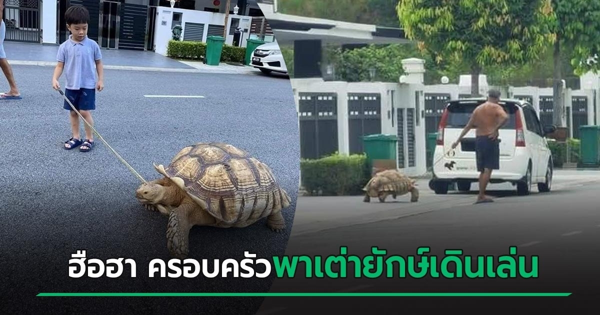ครอบครัวชาวมาเลเซีย พาเต่ายักษ์ไปเดินเล่นในหมู่บ้าน ทำตื่นตาฮือฮา โซเชียลแซวขำ ๆ คงต้องใช้เวลาทั้งวัน ขณะที่อีกส่วนสงสัย ทำไมต้องใช้เชือกจูง