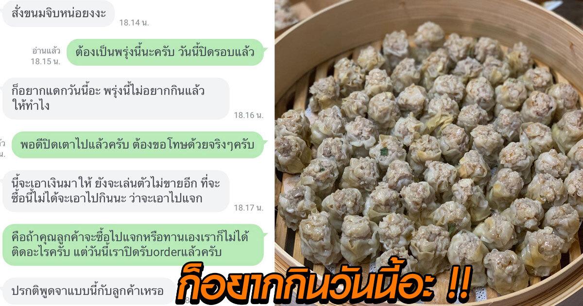 ภาพแชตฮา ๆ จากเฟซบุ๊กเพจ Teens of Thailand ที่กำลังได้รับความสนใจจากชาวเน็ตเป็นจำนวนมาก หลังจากที่มีลูกค้าท่านหนึ่งทักแชตสั่งขนมจีบ พ่อค้าบอกว่าวันนี้ปิดรอบออเดอร์แล้ว ต้องเป็นพรุ่งนี้แทน ก่อนที่จะตอบกลับไปว่า ก็อยากกินวันนี้อะ พรุ่งนี้ไม่อยากแล้ว !! จากนั้นลูกค้าก็เริ่มกวนประสาทพ่อค้าจนหมดความอดทน ด่ากลับแบบจัดเต็ม แทบจะบล็อกแชตหนีไปเลยทีเดียว