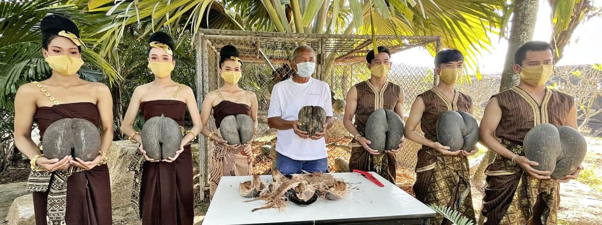 นายกัมพล ตันสัจจา ประธานสวนนงนุชพัทยา กล่าวว่า สำหรับมะพร้าวก้นสาว หรือมะพร้าวทะเล และอีกชื่อ มะพร้าวแฝด (LODOICEA MALDIVICA) จัดเป็นปาล์มชนิดหนึ่ง มีถิ่นกำเนิดอยู่บนเกาะเล็ก ๆ ประเทศซีเซลล์ ในมหาสมุทรอินเดีย เป็นเมล็ดที่มีขนาดใหญ่ที่สุดและหนักที่สุดในโลก มีความยาวมากถึง 12 นิ้ว และน้ำหนักประมาณ 40 ปอนด์ ลักษณะผลเหมือนมะพร้าว 2 ลูกติดกัน จึงเป็นที่มาของชื่อ มะพร้าวแฝด หรือมะพร้าวก้นคน ใช้เวลา 6 ปีกว่า เมล็ดจะสุก และใช้เวลาอีกอย่างน้อย 2-3 ปี ในการงอกและใช้เวลาอีก 1 ปี สำหรับให้ใบแรก ถือเป็นพืชหายากชนิดหนึ่งของปาล์มชนิดนี้