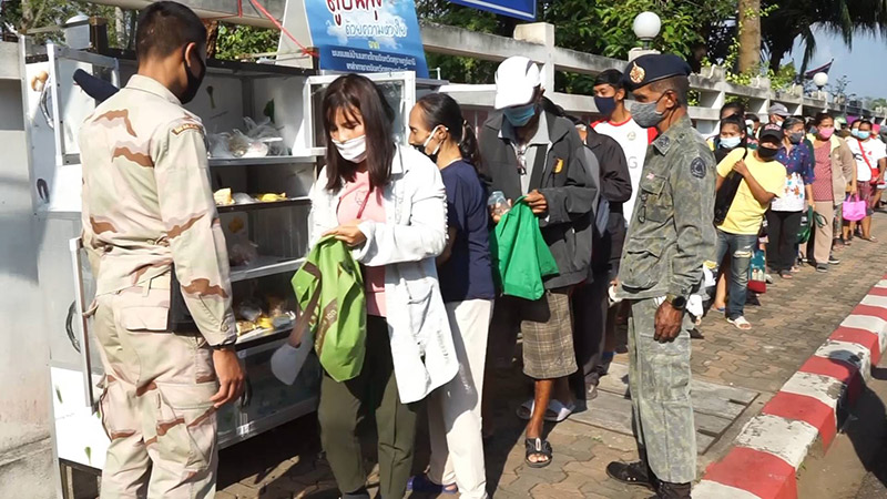 ผู้ว่าฯ สุราษฎร์ธานี ตั้งตู้ปันสุข ประชาชนแห่ต่อคิวยาวเหยียดกว่า 200 คน กรูหยิบของอลหม่าน บางคนหยิบแต่พอดี บางคนวนมาหลายรอบ แถมไม่แบ่งคนอื่น 10 นาที หมดเกลี้ยง
