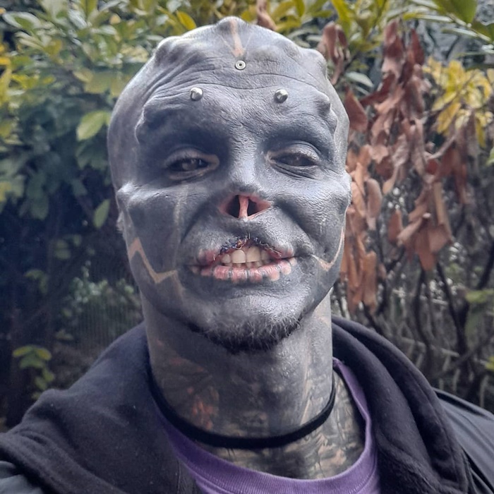 โดยหลังจากเคยผ่านการสักสีดำบนผิวหนังมาทั้งตัว ตลอดจนฝังปุ่มหนังลงบนหน้า ตัดหูออกไปแล้วทั้ง 2 ข้าง สักลูกตาดำ และผ่าลิ้นเป็น 2 แฉก การเปลี่ยนแปลงตัวเองใหม่ที่เขาเพิ่งจะทำเสร็จไปนั้น ก็คือการเชือดจมูกของตัวเองออก รวมถึงการศัลยกรรมตัดริมฝีปากบนออกไป