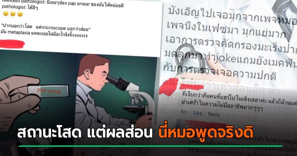 การตรวจมะเร็งปากมดลูกนั้น ถือเป็นสิ่งจำเป็นสำหรับผู้หญิง เพื่อที่ถ้าหากเจอแล้วจะรักษาได้ทันท่วงที ซึ่งแน่นอนว่า ผู้หญิงจำนวนมากไม่กล้าไปตรวจเพราะอาย การจะไปหากหมอเพื่อพูดคุยในเรื่องแบบนี้ ต้องใช้ความกล้าอย่ามหาศาลวันที่ 31 มกราคม 2564 ในโลกโซเชียลเน็ตเวิร์ก ต่างมีการแชร์ข้อความจากเพจหมอเพจหนึ่ง ซึ่งเล่นมุกคนไข้ตรวจปากมดลูก โดยที่ระบุสถานะว่าโสด ซึ่งทางบุคลากรทางแพทย์ กลับไปแซวผลตรวจว่า ส่อน เพราะเคยมีประสบการณ์ทางเพศมาแล้ว