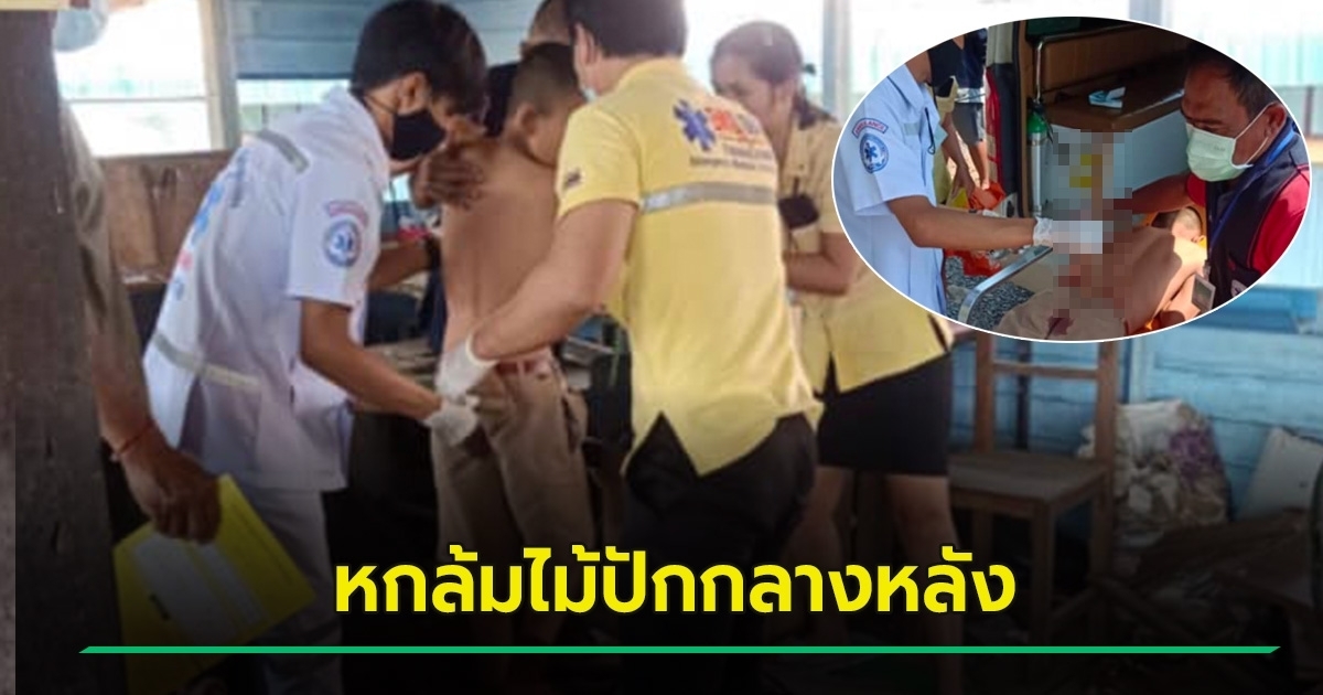 เกิดอุบัติเหตุเด็กนักเรียนชายพลาดหกล้มในโรงเรียนบ้านตากแว้ง ถูกไม้เสียบปักคาหลัง เจ้าหน้าที่กู้ภัยเร่งปฐมพยาบาล ก่อนนำตัวส่งโรงพยาบาลบ่อไร่