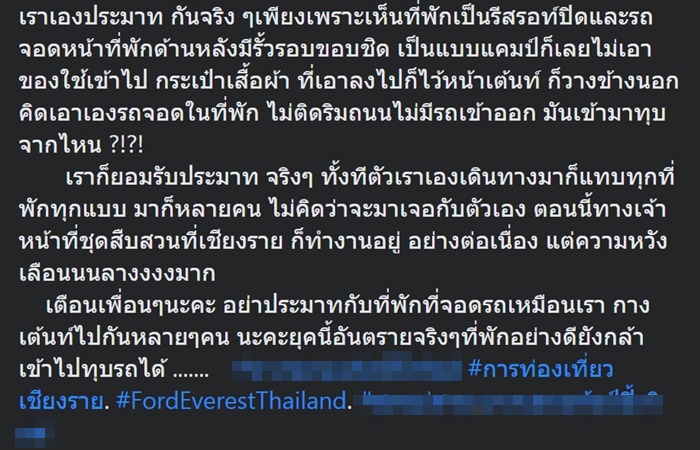 ผู้เสียหายโพสต์เตือนภัย เข้าพักรีสอร์ตสไตล์แคมปิ้งที่ จ.เชียงราย ตื่นเช้ามาถูกมิจฉาชีพทุบกระจกรถ ขโมยข้าวของไปกว่าแสนบาท ที่พักดูปลอดภัยก็ไม่รอด