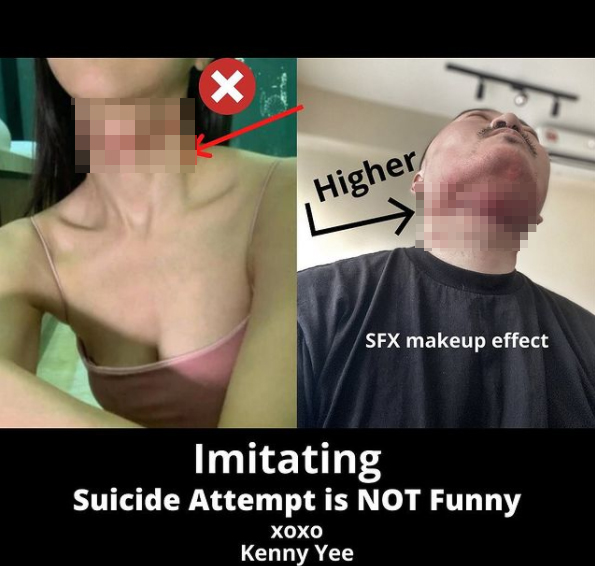 เคนนี่ อี ยังใช้เครื่องสำอางแต่งรอยแผลให้ดู บอกว่าถ้าคนแขวนคอจริง ๆ แนวของเชือกน่าจะอยู่ใกล้กับขากรรไกรมากกว่านี้ นอกจากนี้คนที่รอดชีวิตจากการแขวนคอยังอาจเผชิญกับอาการบาดเจ็บสาหัสหลายอย่าง รวมถึงมีโอกาสที่สมองจะขาดเลือด คงไม่มีเวลามาถ่ายเซลฟี่สวย ๆ แบบนี้ได้ ดังนั้น เขาขอย้ำว่าการฆ่าตัวตายไม่ใช่เรื่องตลก และไม่ควรถูกนำมาใช้เรียกร้องความสนใจ