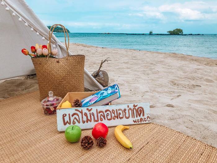 ขณะเดียวกัน ในภาพมุมกว้างของจุดถ่ายรูป ก็เป็นเสื่อปูอยู่ริมชายหาด มีผลไม้ปลอมวางอยู่หลายอย่าง พร้อมมีข้อความเขียนชัด ๆ ว่า "ผลไม้ปลอมอย่ากัดนะคะ" เป็นการประกาศให้ลูกค้ารู้ชัดเจนว่า อย่าทำแบบนี้เลย