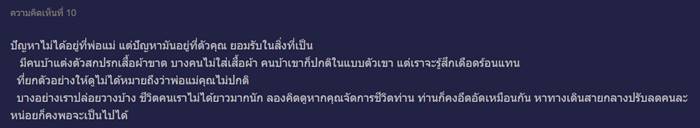 พร้อมยกตัวอย่างว่า ครอบครัวเจ้าของกระทู้ไม่ได้ยากจน พ่อแม่ส่งเสียอย่างดีจนได้ทำงานที่มีหน้ามีตาทางสังคม ปัจจุบันทั้งคู่เกษียณแล้ว เจ้าตัวก็มักซื้อเสื้อผ้าของใช้ดี ๆ มาให้ เป็นของแบรนด์เนมบ้าง แต่พ่อแม่กลับไม่ใช้ และมักแต่งตัวไม่ค่อยถูกกาลเทศะออกไปนอกบ้าน เช่น ไปติดต่อราชการ ไปงานแต่งงาน หรือไปโชวร์รูมรถเบนซ์ ก็จะถูกมองด้วยสายตาไม่ดี เจ้าตัวไม่อยากให้พ่อแม่ถูกกระทำแบบนั้น