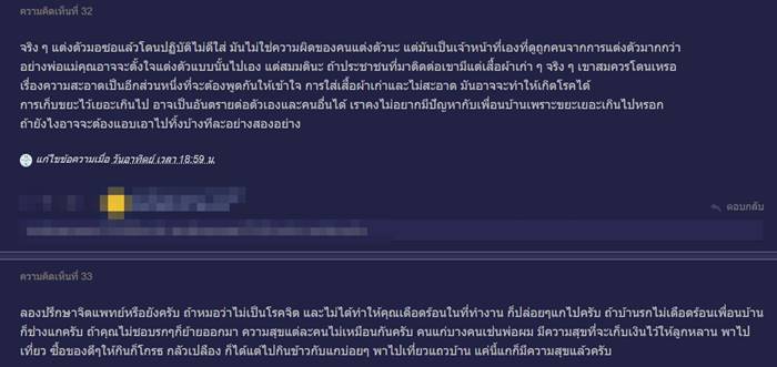 แต่ทว่า ก็มีบางส่วนที่มองว่าเจ้าของกระทู้คิดมากไปหรือไม่ และการแต่งตัวธรรมดาไปข้างนอกไม่ผิด และไม่จำเป็นต้องแบรนด์เนม ซึ่งติงเจ้าของกระทู้ที่อ้างว่าการแต่งตัวไม่ถูกกาลเทศะที่เจ้าของกระทู้ว่านั้น อาจเป็นแค่การแต่งตัวไม่ถูกใจเจ้าของกระทู้เท่านั้นหรือไม่