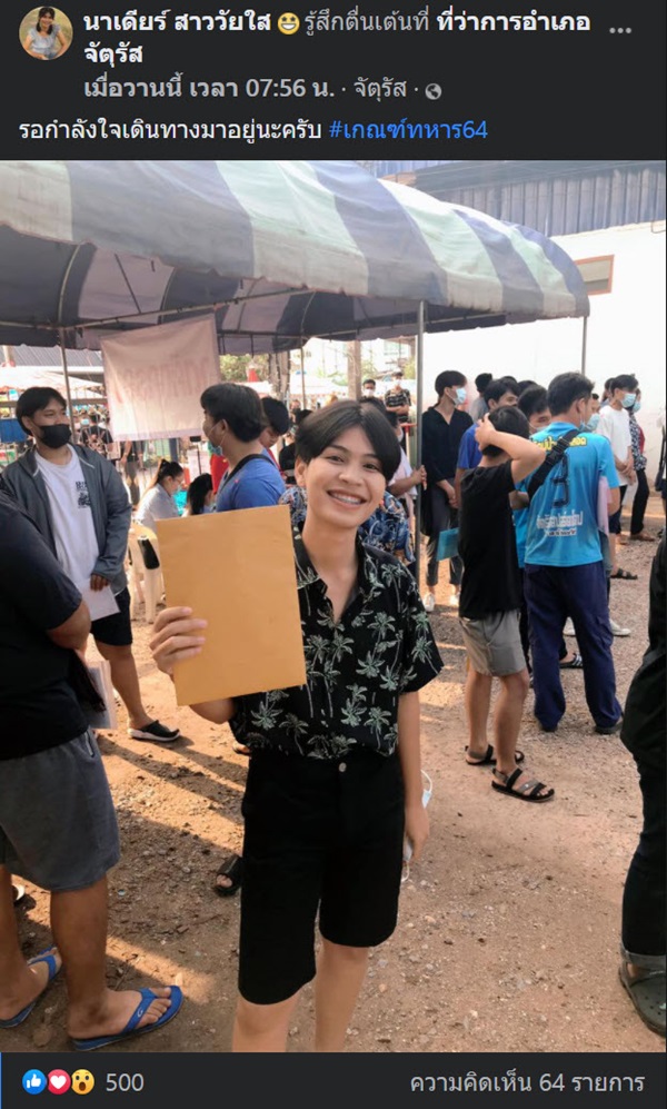 ส่วนที่ตัดสินใจแต่งชาย ตัดผม เข้าจับสลากเกณฑ์ทหาร น้องนาเดียร์ ระบุว่า เธอนั้นมีใบรับรองแพทย์เกี่ยวกับเพศสภาพไม่ตรงเพศที่กำเนิด จะแต่งหญิงสวย ๆ ไปรายงานตัวให้คนตะลึงทั้งอำเภอก็ทำได้ แต่ความฝันที่อยากทำตั้งแต่วัยเด็ก คือโมเมนต์ที่ได้เข้าไปล้วงไห จับใบดำใบแดง ในใจไม่ได้อยากเป็นทหารแค่อยากลองลุ้นเท่านั้น ผลออกมาก็เป็นไปตามที่คิดไว้จริง ๆ นึกไม่ออกเหมือนกันว่าถ้าได้ใบแดงจะไหวไหม ใช้ชีวิตในกรมยังไง ยอมรับว่าเมื่อวานเป็นวันที่ตื่นเต้นที่สุดในชีวิตจริง ๆ