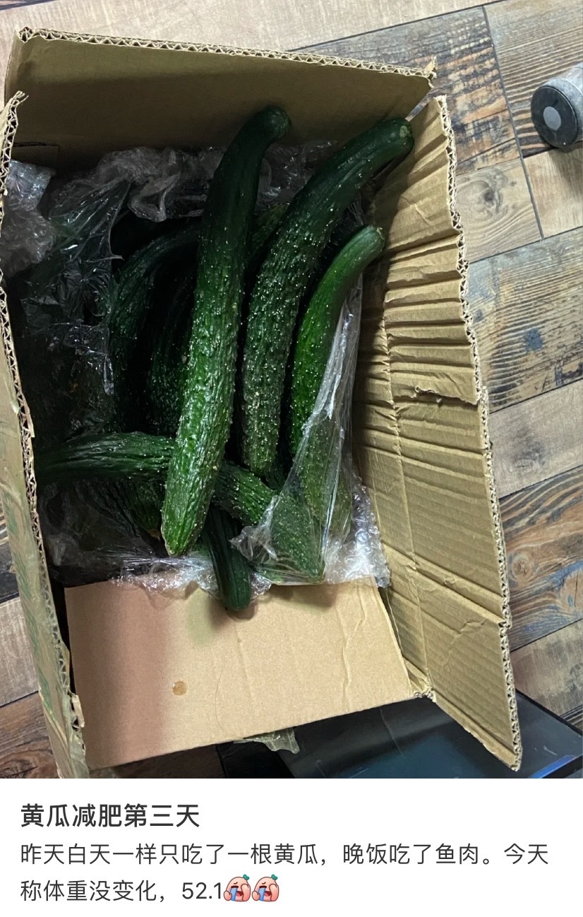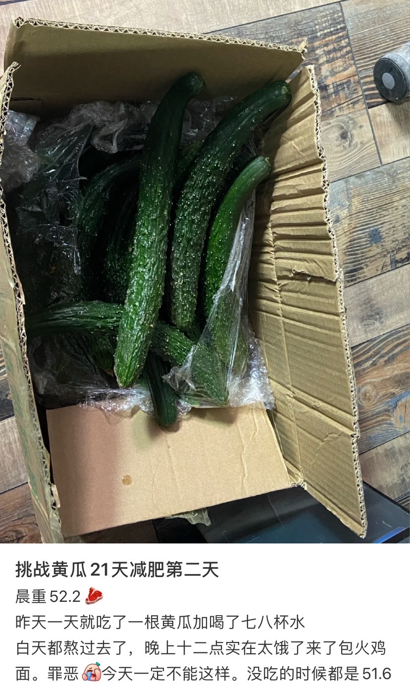 เป็นกระแสที่พูดถึงในโซเชียลมีเดียของจีน สำหรับเทรนด์ฮิตการทำชาเลนจ์ ลดน้ำหนักด้วยการกินแตงกว่า 21 วัน หลายคนมีการแชร์เรื่องราวประสบการณ์ของตัวเอง แต่ที่พีคสุดก็เห็นทีว่าจะเป็นของสาวรายนี้ จนทำให้เกิดเป็นแฮชแท็กที่แปลได้ว่า #อย่าลองลดน้ำหนักด้วยแตงกวาแบบง่ายๆ