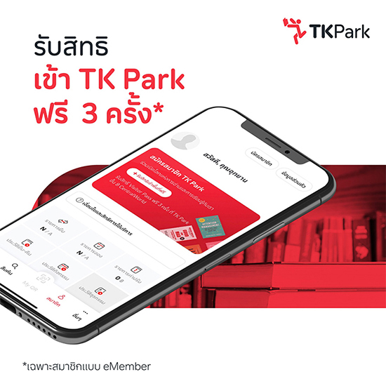 สำหรับสมาชิก eMember สมัครผ่านแอปฯ MyTK หรือทาง www.tkpark.or.th สามารถใช้บริการ TK Public Online Library ฟรี พร้อมรับสิทธิเข้า TK Park ชั้น 8 Central World ได้ฟรี จำนวน 3 ครั้ง หมดอายุภายใน 1 ปี นับจากวันรับสิทธิครั้งแรก