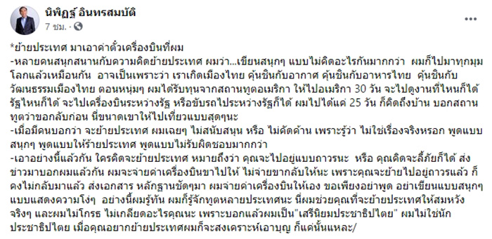 นิพิฏฐ์ อินทรสมบัติ อดีต ส.ส. พรรคประชาธิปัตย์ โพสต์ถึงกลุ่ม ย้ายประเทศกันเถอะ ลั่นมาเอาค่าตั๋วเครื่องบินที่ผม รู้แค่พูดกันขำ ๆ ให้ร้ายประเทศ โวรู้จักทูตหลายประเทศจะสงเคราะห์เอาบุญ