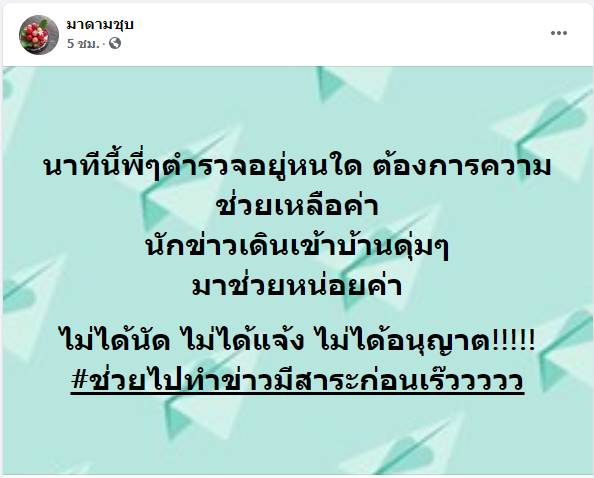 ล่าสุด (7 พฤษภาคม 2564) เฟซบุ๊ก มาดามชุบ ได้โพสต์ข้อความถามหาเจ้าหน้าที่ตำรวจ เพราะจู่ ๆ ก็มีนักข่าวเดินดุ่ม ๆ มาที่บ้านโดยไม่ได้นัดก่อนแถมไม่ได้รับอนุญาต จนเจ้าของร้านต้องพาลูกหนี ระบุว่าการบุกเข้าบ้านแบบนี้ไม่น่ารัก เจ้าของบ้านไม่เต็มใจ เพราะสื่อนี้มาแป๊บเดียว เดี๋ยวสื่ออื่นก็มาอีก ไม่ได้อยากเป็นกระแสอะไรเลย วอนไปทำข่าวอื่นที่มีสาระก่อน