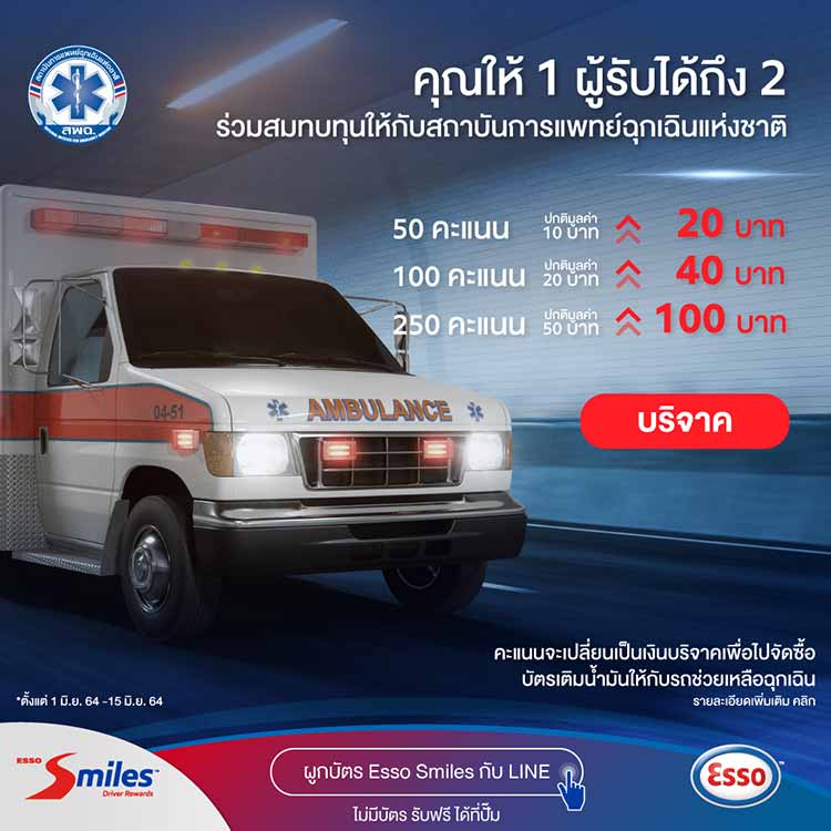 บริษัท เอสโซ่ (ประเทศไทย) จำกัด (มหาชน) ขอเชิญร่วมเป็นส่วนหนึ่งในการรวมพลังต้านภัย Covid-19 เพียงสมาชิกบัตรเอสโซ่ สไมล์ส ใช้คะแนนสะสมเปลี่ยนเป็นเงินบริจาคเพื่อนำไปจัดซื้อบัตรเติมน้ำมัน เพื่อนำไปมอบให้กับสถาบันการแพทย์ฉุกเฉินแห่งชาติ ในการขนส่งผู้ป่วย