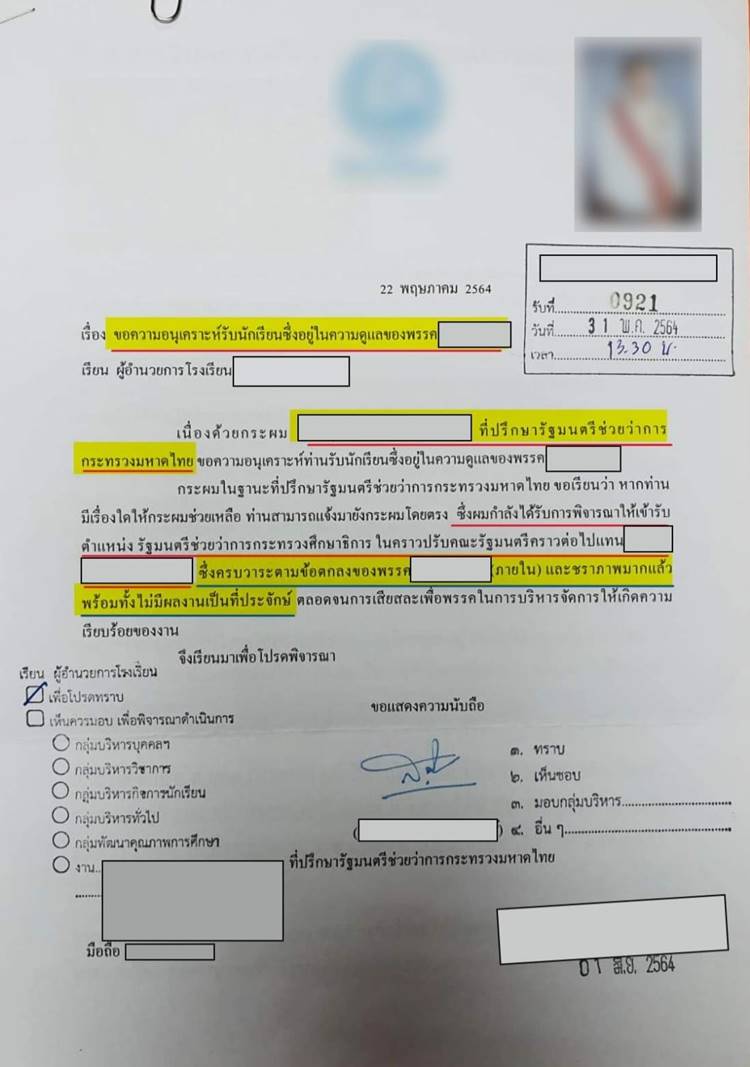 สำหรับเนื้อหาในเอกสารดังกล่าวระบุว่าขอความอนุเคราะห์ให้กับนักเรียนที่อยู่ในความดูแลของพรรคการเมืองหนึ่ง เพื่อให้เข้าเรียนโรงเรียนชื่อดัง โดยที่ปรึกษารัฐมนตรีช่วยว่าการกระทรวงมหาดไทย ระบุว่าหากผู้อำนวยการโรงเรียนต้องการให้ตนช่วยเหลือ สามารถติดต่อได้โดยตรง ซึ่งตนกำลังได้รับการพิจารณาเข้ารับตำแหน่งรัฐมนตรีช่วยว่าการกระทรวงศึกษาธิการในคราวปรับคณะรัฐมนตรีครั้งต่อไป