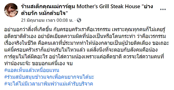 "อย่าบอกว่าสิ่งที่เกิดขึ้น กับครอบครัวเราคือเวรกรรม เพราะคุณทุกคนก็ไม่เคยรู้อดีตชาติตัวเอง อย่ายัดเยียดความผิดที่น้องเป็นหรือโดนกระทำ ว่าคือเวรกรรม เรื่องจริงในชีวิต คือคนเลวที่ประมาททำให้น้องกลายเป็นผู้ป่วยติดเตียง ขอเถอะ แค่นี้ครอบครัวเราก็แย่จนรับไม่ไหวแล้ว แต่สิ่งหนึ่งที่จะตอบกับสังคม คือน้องการ์ตูนไม่ได้ผิดอะไร อย่าใส่ความน้องเพราะแค่อดีตชาติ ควรจะใส่ความคนที่ทำน้องนะจ๊ะ ขอบอกแค่นี้เอง จบ"