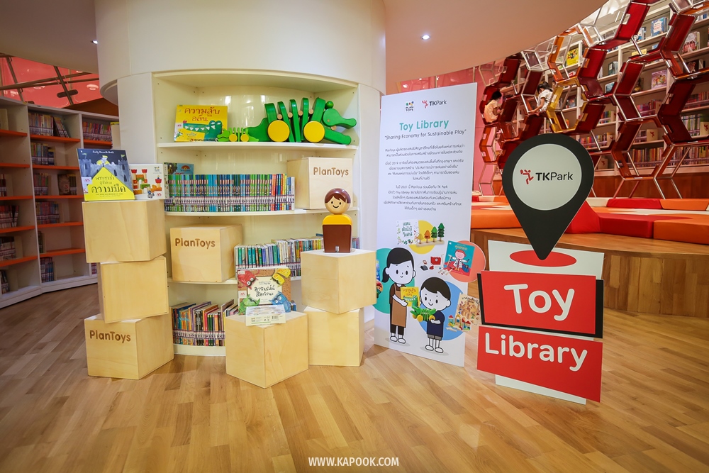 ห้องสมุดของเล่นโซนนี้ต้องถูกใจคุณน้อง ๆ หนู ๆ อย่างแน่นอน เพราะมีทั้งหนังสือและของเล่นเสริมทักษะที่ผลิตจากวัสดุธรรมชาติ โดยบริษัทชั้นนำอย่าง PlanToys กว่า 30 ชุด มาคู่กับหนังสือในธีมเดียวกันที่คัดสรรโดยบรรณารักษ์ของ TK Park เพื่อให้เด็ก ๆ เรียนรู้และเสริมทักษะได้จากการเล่นที่สนุกสนาน และยังสามารถยืมกลับไปเล่นที่บ้านได้อีกด้วย