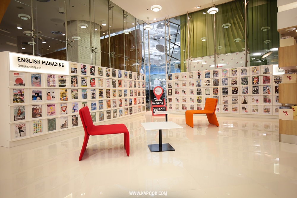 ใกล้ ๆ กันจะเป็นโซนสำหรับนั่งอ่านหนังสือที่กว้างขวาง โล่ง โปร่ง สบายตา มีมุมกำแพงนิตยสารขนาดใหญ่สลับไปกับชั้นหนังสือที่สามารถเข้าถึงได้ง่าย ๆ ชอบเล่มไหนก็ดึงกล่องออกแล้วหยิบขึ้นมาอ่านได้ทันที เลือกนั่งได้ตามใจ ไม่ว่าจะเป็นแบบโต๊ะรวมสบาย ๆ หรือที่นั่งเดี่ยวเพิ่มความเป็นส่วนตัวก็ได้