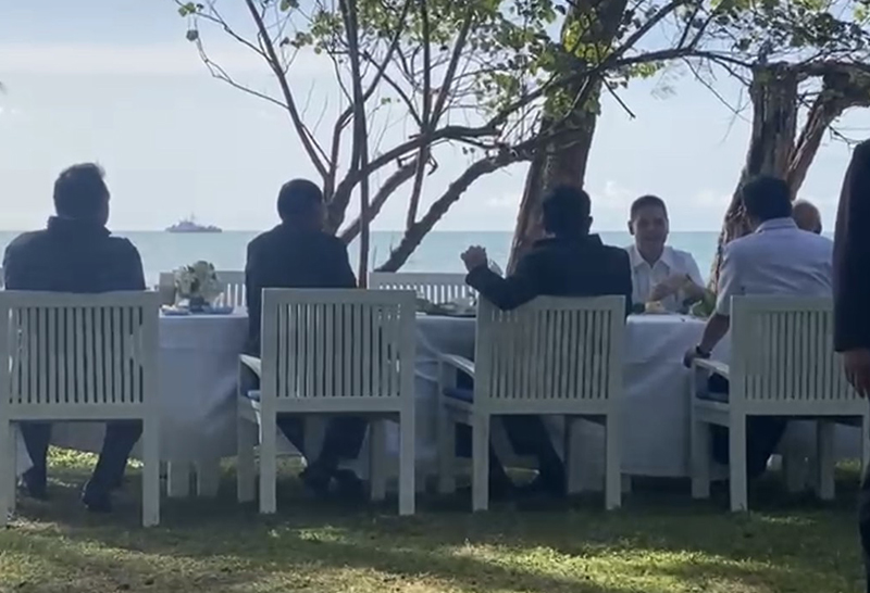 อีกภาพหนึ่งที่เป็นปัญหา คือการที่ พล.อ. ประยุทธ์ พร้อมคณะได้นั่งล้อมวงบนโต๊ะริมทะเล โดยไม่สวมแมสก์ ไม่เว้นระยะห่าง ชมวิวอย่างสบายใจ ทั้งที่มีประกาศห้ามรวมตัวกัน และต้องรักษาระยะห่าง เพื่อป้องกันไม่ให้ติดโควิด 19